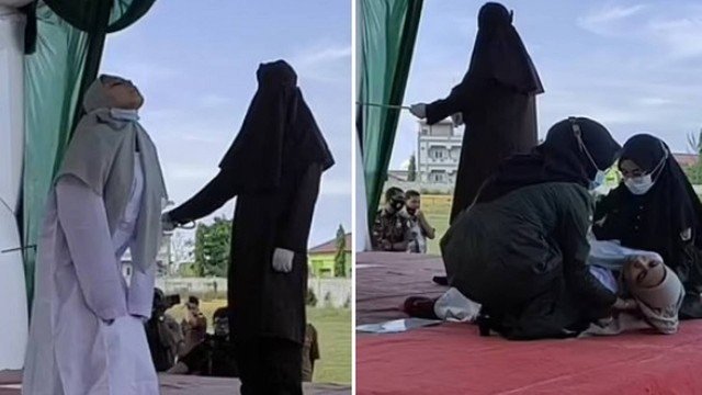 INDONÉSIA | Uma mulher punida com 100 chibatadas por ter feito sexo antes do casamento acabou não resistindo aos golpes da vara de junco e acabou desmaiando de dor.