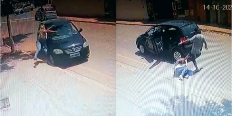 Nas imagens gravados por câmeras de segurança é possível ver que a vítima caminhava pela calçada quando um carro passa em alta velocidade e atinge a vítima. Na sequência, moradores ajudam a mulher, mas o agressor desce do veículo e a arrasta pelos cabelos no meio da rua.