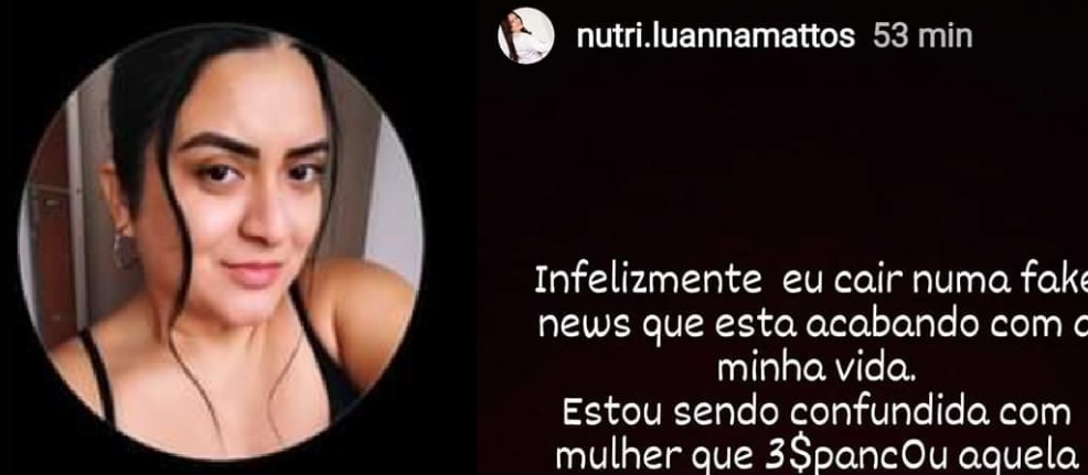 Ela fez um desabafo: “Infelizmente eu cai numa Fake News esta acabando com a minha vida. Estou sendo confundida com a mulher que espancou aquela criança. Por temos os mesmos nomes (se que é que o nome dela é esse mesmo). Pra deixar registrado acabei de fazer B.O no 19º DIP. Peço que compartilhem a verdade, porque a mentira que está sendo propagada está destruindo a minha vida”, disse.