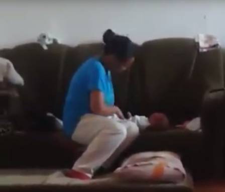 A mulher bate 42 vezes na cabeça do bebê deitado no sofá, que chora sem parar.