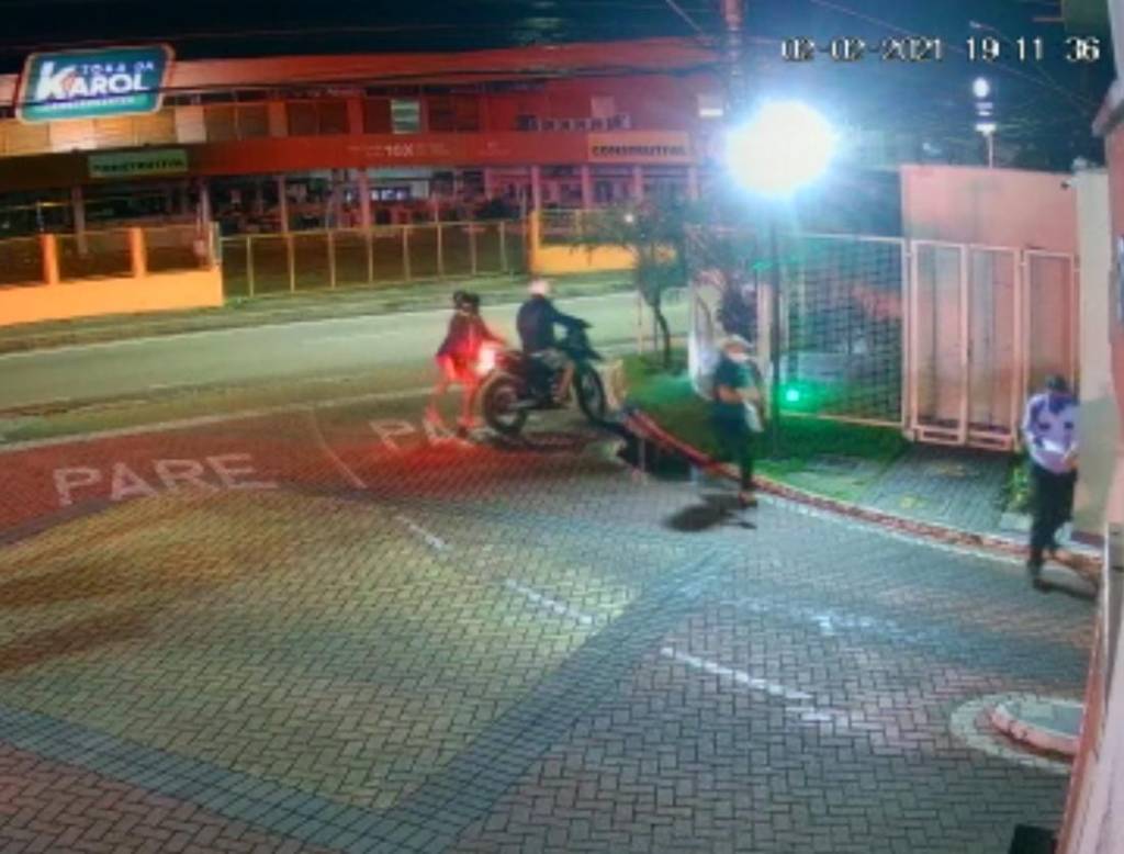 Nas imagens, é possível ver a mulher mexendo em seu aparelho celular, quando a dupla se aproxima para roubar o objeto. No momento da ação, a vítima se assusta e acaba correndo desesperada. Um vigilante que atua no local também correu dos bandidos que deram meia volta e fugiram do local; veja;