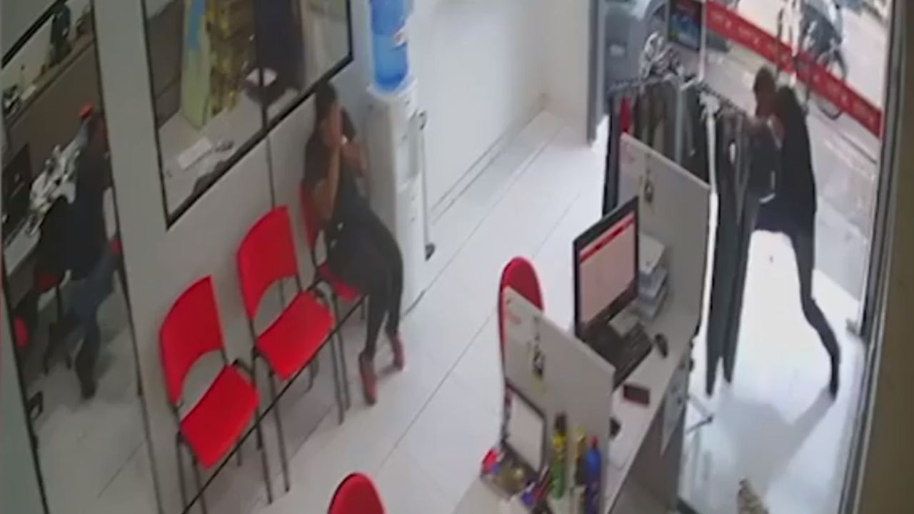 Nas imagens captadas por câmeras de segurança, a mulher aparece sentada na recepção, junto com um homem. No momento em que um bandido chega no local e anuncia o assalto, o rapaz que estava sentado perto da moça, saca a arma e os dois trocam tiros.