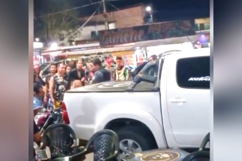 Nas imagens, a mulher aparece furiosa batendo no capô da Hilux de cor branca. Ela rapidamente é impedida por um policial militar que passava na mesma hora pelo local, para a sorte do infiel.