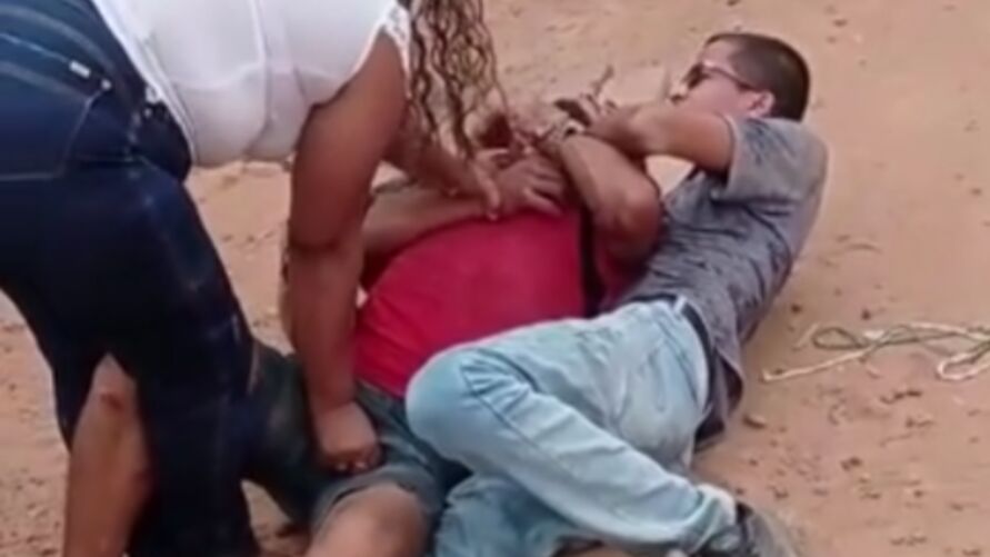 Nas imagens, o homem já está imobilizado com um rapaz que aparece dando um “mata-leão”. Eles já estão no chão e a mulher aparece segurando os testículos do suspeito, aparentemente com força e ódio.