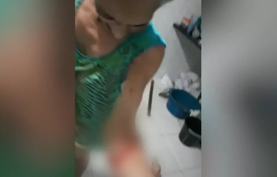 Segundo a mulher, quando o rapaz viu o comerciante, desceu do telhado, entrou na casa e voltou com uma cadeira para atingi-lo. Para se defender, o homem usou a foice. Como a vítima segurava o filho, acabou atingida.