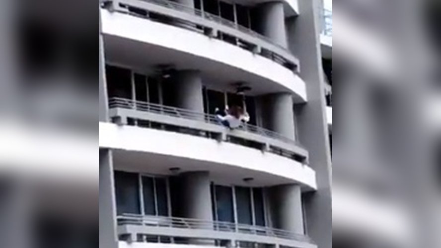 No vídeo publicado no Twitter se pode ver o momento em que a mulher se encontra sentada de costas no corrimão de um dos apartamentos. Com um pau de selfie na mão, ela tenta se segurar em uma das barras da varanda, mas perde o equilíbrio e cai para trás.