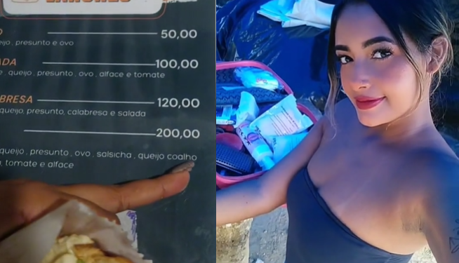 “Vou mostrar o cardápio pra depois vocês não dizerem que é mentira”, diz ela, que já havia mostrado que uma Coca-Cola em lata também custa os “olhos da cara”: R$ 50. O menos caro para se comer, um misto, tem o mesmo valor.