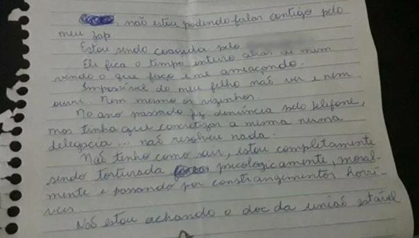 No bilhete, a vítima contou que sofria agressões físicas e psicológicas. Ela também alegou que não podia receber amigos em casa e só podia mexer no celular se o marido estivesse perto, já que ele manitorava o tempo de suas ligações.