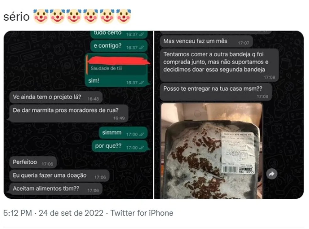 Uma das coordenadoras. Eduarda Poleza, expôs a mensagem de uma ‘amiga’ querendo fazer uma boa ação: a doação de um quilo de carne vencida há 1 mês.