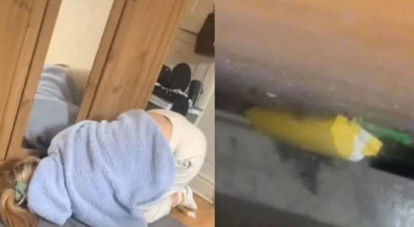 Nas imagens, é possível ver ela tentando alcançar o item sob o móvel. Tranquilo, o namorado grava e ri da situação demonstrando estar ‘nem aí’ com o caso suspeito.