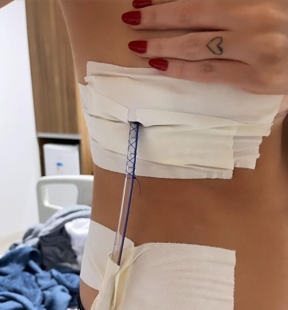 Para tirar o ar da região, Jessika está fazendo uso de um dreno e deve continuar internada por tempo indeterminado.