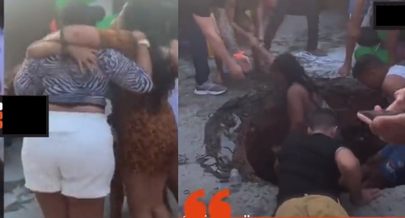 Todas elas despencaram em uma fossa cheia de cocô. Apesar do susto, os outros convidados se uniram para resgatar o grupo do buraco. Outras pessoas deram risada da situação inusitada.