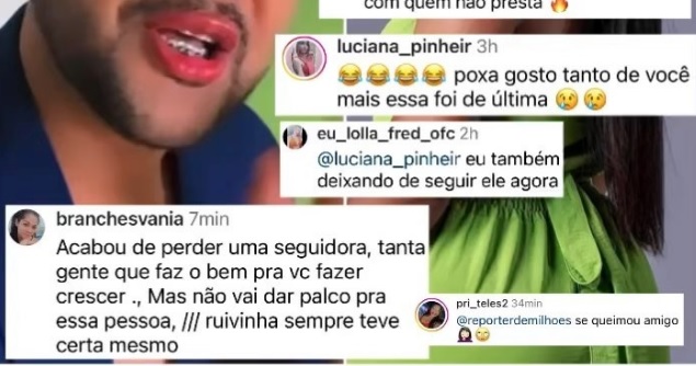 O influenciador que se diz “o repórter de milhões” tem mais de 100 mil seguidores, mas amulherada não gostou de saber da entrevistada no canal dele. “Vou deixar de seguir só porque se misturou com quem não presta”, disse uma. “A acabou de perder uma seguidora, tanta gente que faz bem para você crescer mas vai dar palco para essa pessoa. Ruivinha sempre esteve certa mesmo”, rebateu a outra.