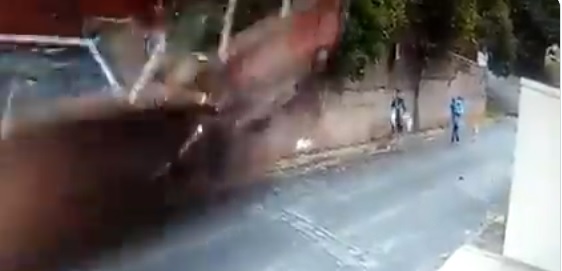 Nesse momento, grande parte do muro desaba e quase atinge a família. O homem leva um susto e se afasta rapidamente, enquanto a mulher se vira para ir na direção contrária.