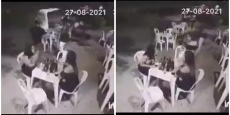 Câmeras de segurança do local mostram o momento que o amigo do rapaz avista a titular chegando e corre para alertá-lo sobre o perigo que se aproxima. Sem pensar duas vezes, o homem pega uma das cadeiras do bar e carrega como se fosse um funcionário, fugindo de mansinho.