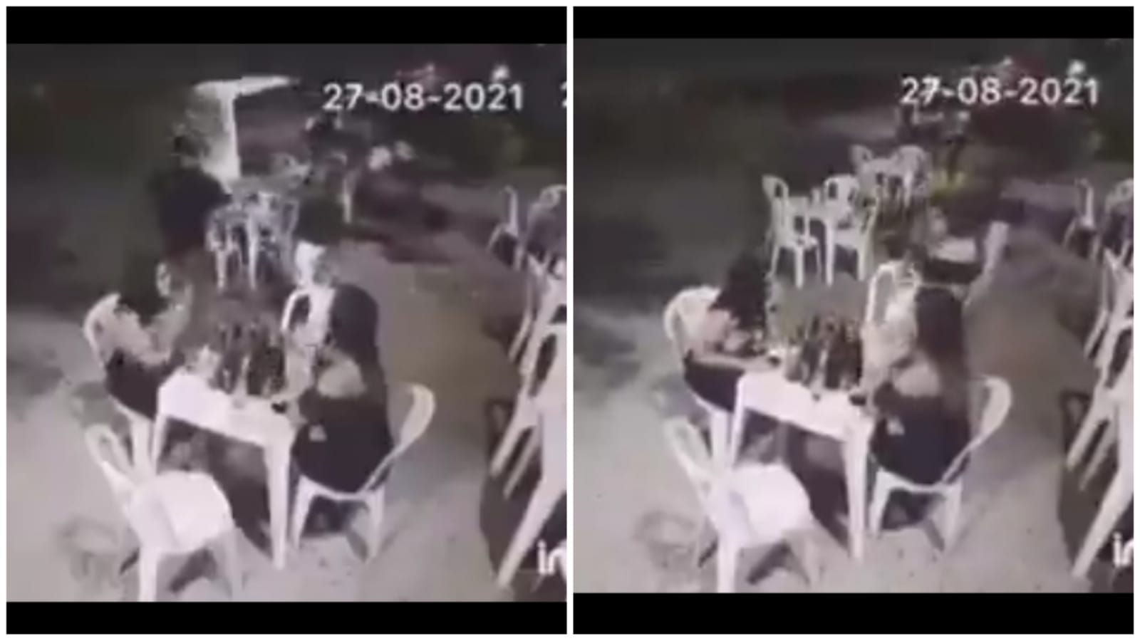 Câmeras de segurança do local mostram o momento que o amigo do rapaz avista a titular chegando e corre para alertá-lo sobre o perigo que se aproxima. Sem pensar duas vezes, o homem pega uma das cadeiras do bar e carrega como se fosse um funcionário, fugindo de mansinho.