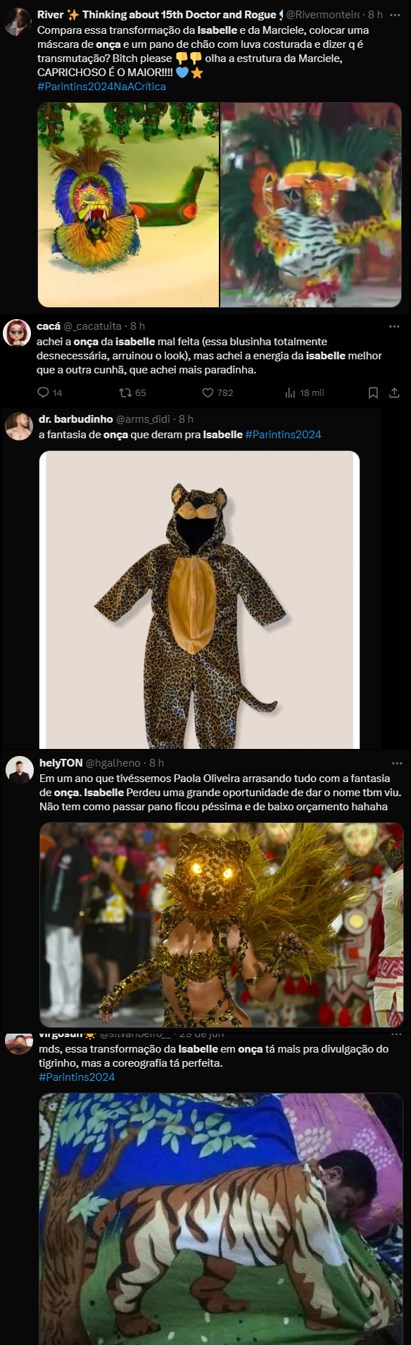 Apesar da emoção e esforço da amazonense em entregar um bom trabalho, muitos comentários decepcionados rolaram pela internet, questionando o orçamento da roupa e também a entrada dela na arena. Após a participação no programa na Globo, era esperado que ela fosse ter um grande destaque e a melhor indumentária. Veja: