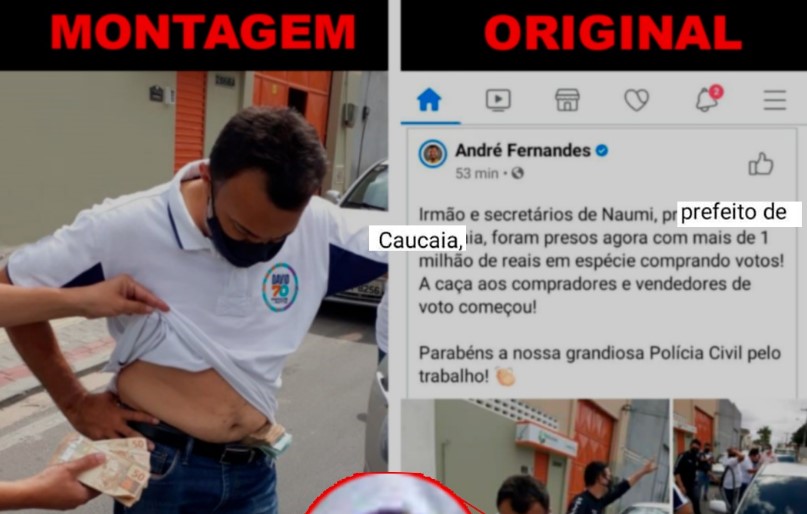 A notícia real mostra claramente que as fotos originais são de uma prisão realizada na manhã deste sábado (28) pela Polícia Civil do Ceará, que capturou o irmão e secretários de Naumi Amorim (PSD), candidato a reeleição em Caucaia (CE), cujo número é 55.