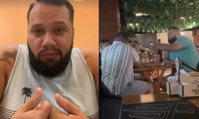 MANAUS (AM) – Matando a curiosidade dos fofoqueiros de plantão, um homem identificado como Felipe Lima, que teria sido traído pelo namorado, foi às redes sociais e deu detalhes da briga filmada dentro de um restaurante no Amazonas Shopping. Ele jogou um copo de cerveja na cara do “boy”.