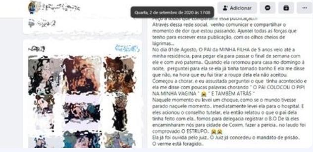 De acordo com a postagem, o suspeito de 29 anos, ficava com a filha nos finais de semana e ao levar a menina de volta para casa da mãe, no dia 1° de agosto, ela acabou descobrindo os abusos cometido pelos suspeitos, após levar a filha para tomar banho. Leia o relato;