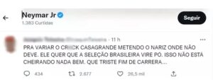 A postagem foi feita na manhã desta terça-feira, 8,. “Pra variar o crack Casagrande metendo o nariz onde não deve. Ele quer que a Seleção Brasileira vire pó. Isso não está cheirando nada bem. Que triste fim de carreira”, dizia o post curtido por Neymar.