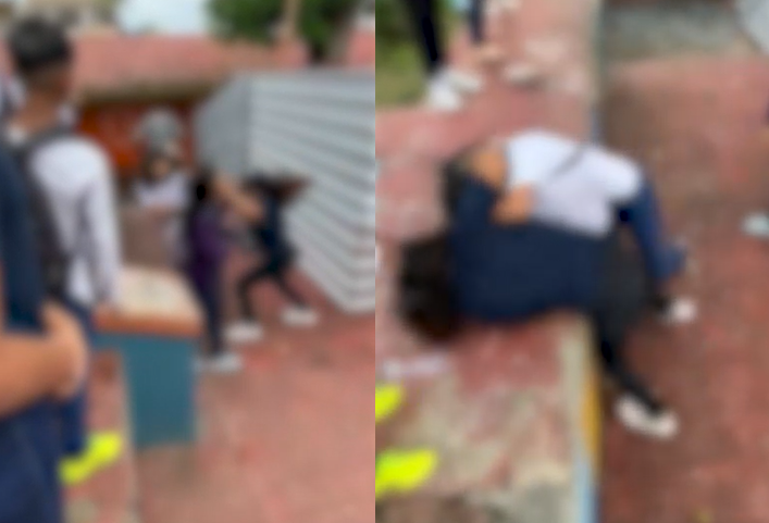 Nas imagens, é possível ver que uma das adolescentes vai para cima da outra e as duas rolam no chão puxando o cabelo uma da outra e dando socos. Vários alunos assistem e parecem torcer para a briga.
