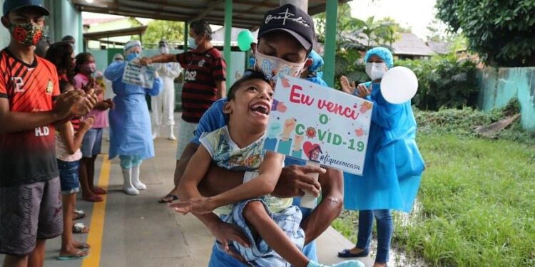 BARREIRINHA – AM | Janderson de Figueiredo Rodrigues, de 6 anos e Eduardo Barbosa, 50 anos, deixaram a sala rosa do Hospital Coriolano Cidade Lindoso na tarde desta quarta-feira (17), no município de Barreirinha. Ambos se recuperaram do novo coronavírus e estão fora do período de transmissão do vírus. Ao deixarem a unidade, os dois foram celebrados após vencer a luta contra a Covid-19.