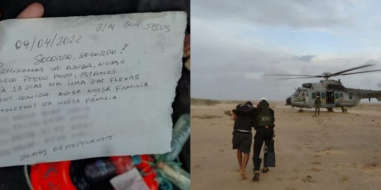Pescadores que estavam pescando na região costeira da ilha encontraram o bilhete e acionaram o socorro. Conforme a Marinha, uma aeronave foi enviada para resgatar os tripulantes. Após receberem os primeiros socorros na aeronave, eles foram encaminhados para um pronto socorro em Belém (PA).