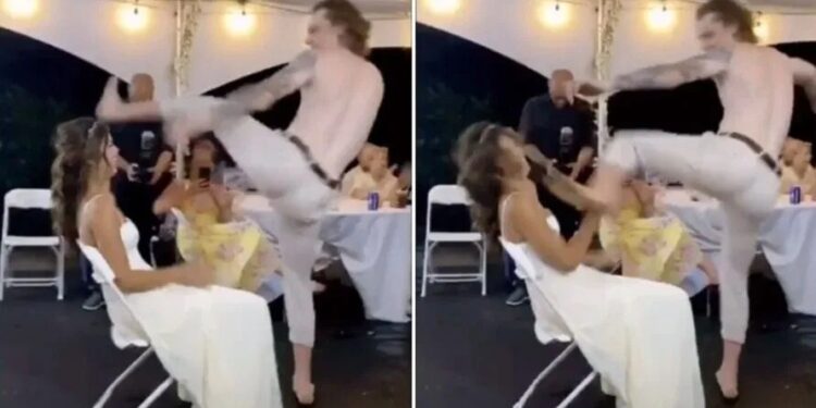 MUNDO | Um homem tentou surpreender a própria esposa durante a celebração do casamento deles, mas o que era para ser uma alegria, acabou virando um acidente. Em um vídeo compartilhado nas redes sociais, o noivo aparece sem camisa, para seduzir sua amada com um passo de uma coreografia, mas acaba acertando um chute na cara dela.
