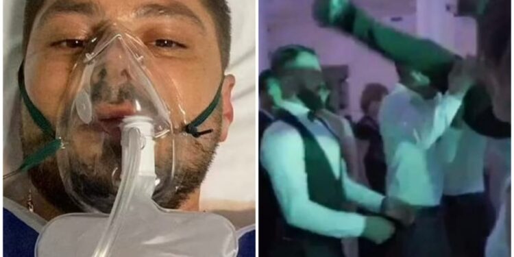 O noivo, de 31 anos, foi jogado para o alto, mas acabou virando de cabeça para baixo na queda. Os homens que participaram da “brincadeira” não conseguiram agarrá-lo e ele atingiu o chão com a nuca.