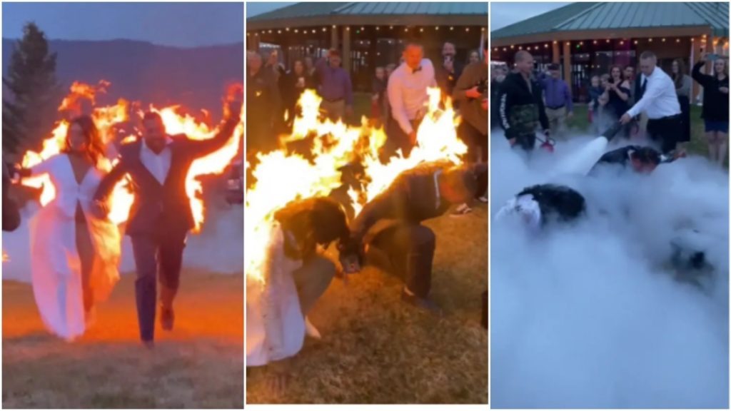 O casal de recém-casados deixou seus convidados atordoados quando se incendiou após a cerimônia, realizada no estado de Utah, nos Estados Unidos.