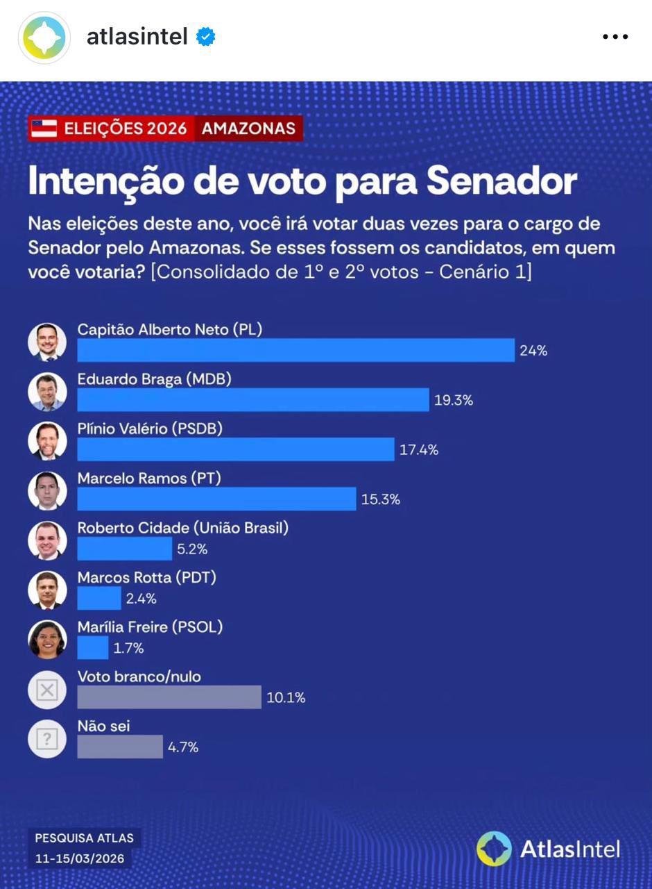 MANAUS (AM) – A pesquisa AtlasIntel divulgada nesta quarta-feira, 18/03, indica liderança numérica do deputado federal Capitão Alberto Neto (PL-AM), na disputa pelo Senado Federal nas Eleições deste ano. No cenário unificado de 1º e 2º votos o parlamentar aprece com 24% de intenções de votos da população amazonense.