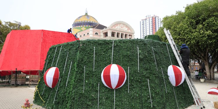 MANAUS (AM) – Muito aguardada pelas famílias amazonenses todos os anos, a ornamentação natalina do Largo de São Sebastião tem como grande destaque, neste ano, o conjunto cenográfico lúdico da grande “Árvore de Natal do Carrossel da Imaginação”, que já está sendo montado no local, a ser inaugurada no dia 1º de dezembro. A concepção é dos artistas Jander Lemos e Marcicley Reggo.