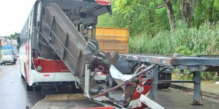MANAUS – AM | A parte traseira de um ônibus da linha 418 foi destruída após o motorista perder o controle e colidir contra uma caminhonete, na manhã desta segunda-feira (14), na rua Abiurana, no bairro Distrito Industrial, zona Sul de Manaus.