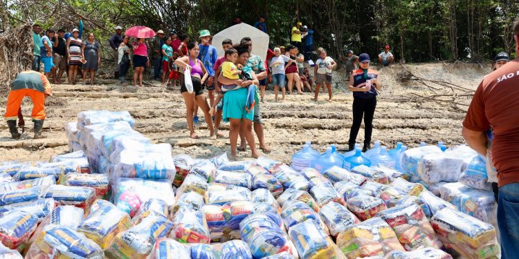 MANAUS (AM) – Mapeado pela Prefeitura de Manaus como uma das áreas críticas afetadas pela severa estiagem que assola o Estado do Amazonas, o bairro Puraquequara, na zona Leste, recebeu, neste sábado, 7/10, ajuda humanitária. Equipes voluntárias das secretarias municipais de Infraestrutura (Seminf), Limpeza Urbana (Semulsp), Meio Ambiente e Sustentabilidade (Semmas), Educação (Semed), da empresa Águas de Manaus e do Conselho Tutelar distribuíram mantimentos a 130 famílias de quatro comunidades ribeirinhas.