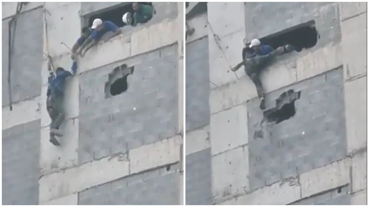 Nas imagens, o homem aparece trajando equipamentos de segurança. Ele se agarra na parede do edifício por algum tempo e é puxado por outros colaboradores.