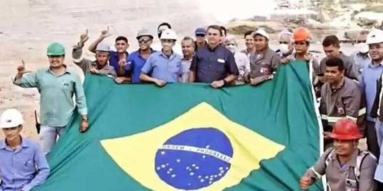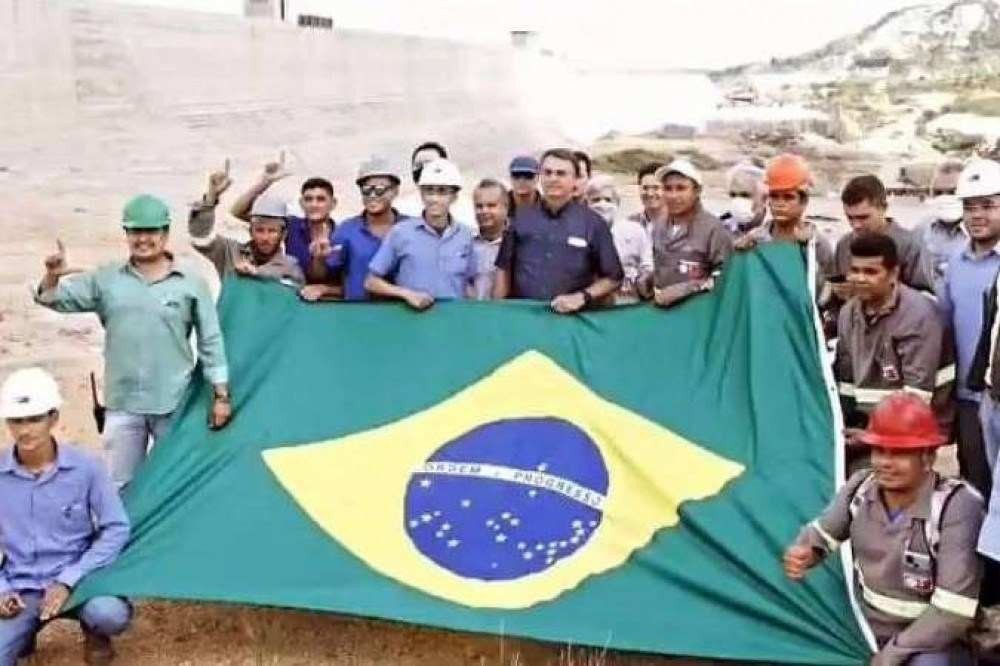 NATAL – RN | Durante a visita do presidente Jair Bolsonaro (sem partido) em Jucurutu, Rio Grande do Norte, nesta quinta-feira (24), operários posaram para uma foto com o chefe do Executivo federal e fizeram um símbolo de “L” com os dedos, gesto associado ao ex-presidente Luiz Inácio Lula da Silva (PT).