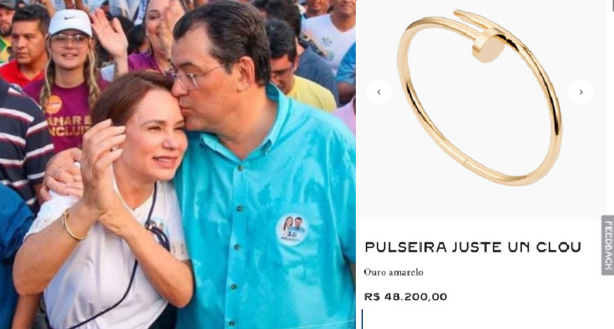 MANAUS (AM) – Não passou despercebido e a pulseira de luxo da marca Cartier, usada por Sandra Braga, esposa do senador Eduardo Braga (MDB), foi notada durante ação de campanha eleitoral. O item custa a “bagatela” de R$ 48.200 mil.