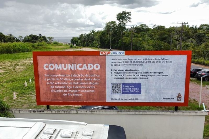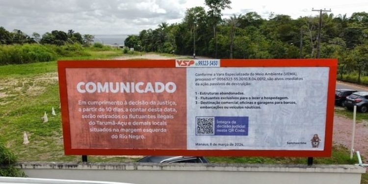 Manaus (AM) – Na sexta-feira (8), outdoors foram instalados na entrada da Marina do Davi e Praia Dourada, na zona oeste de Manaus, comunicando sobre a data de retirada dos flutuantes do lago Tarumã-Açu, na margem esquerda do Rio Negro. O juiz Moacir Pereira Batista, da Vara Especializada do Meio Ambiente do TJAM, determinou a remoção, indicando que, a partir de 10 dias a contar da data, flutuantes ilegais serão retirados do Tarumã-Açu e de outros locais na margem esquerda do Rio Negro. O aviso também especifica que estruturas abandonadas serão destruídas imediatamente, seguidas daquelas destinadas a lazer, hospedagem e uso comercial.