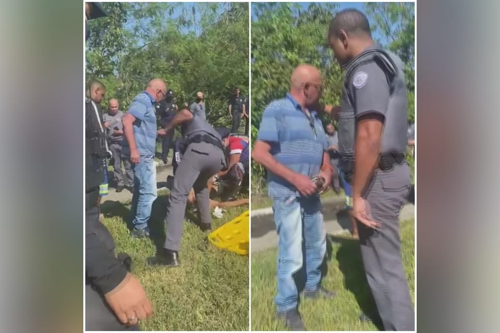 No vídeo, que repercutiu nas redes sociais, o pai é contido por um Policial Militar, para que não avance sobre o rapaz que está recebendo os primeiros socorros após ter sido baleado.