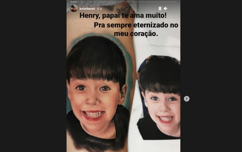 Querendo ajudar Leniel Borel, o tatuador Gustavo Gomes se sensibilizou e realizou o trabalho; “Leniel, você não está sozinho. Como pai, como ser humano, eu fiquei muito mexido com a história do Henry. Não consigo imaginar a dor que o Leniel está sentindo. Por isso, queria ajudar de alguma forma, acho que ajudei eternizando o rostinho dele no braço do Leniel. Ele vai poder olhar todo dia, toda hora, todo instante, para o anjinho dele”.