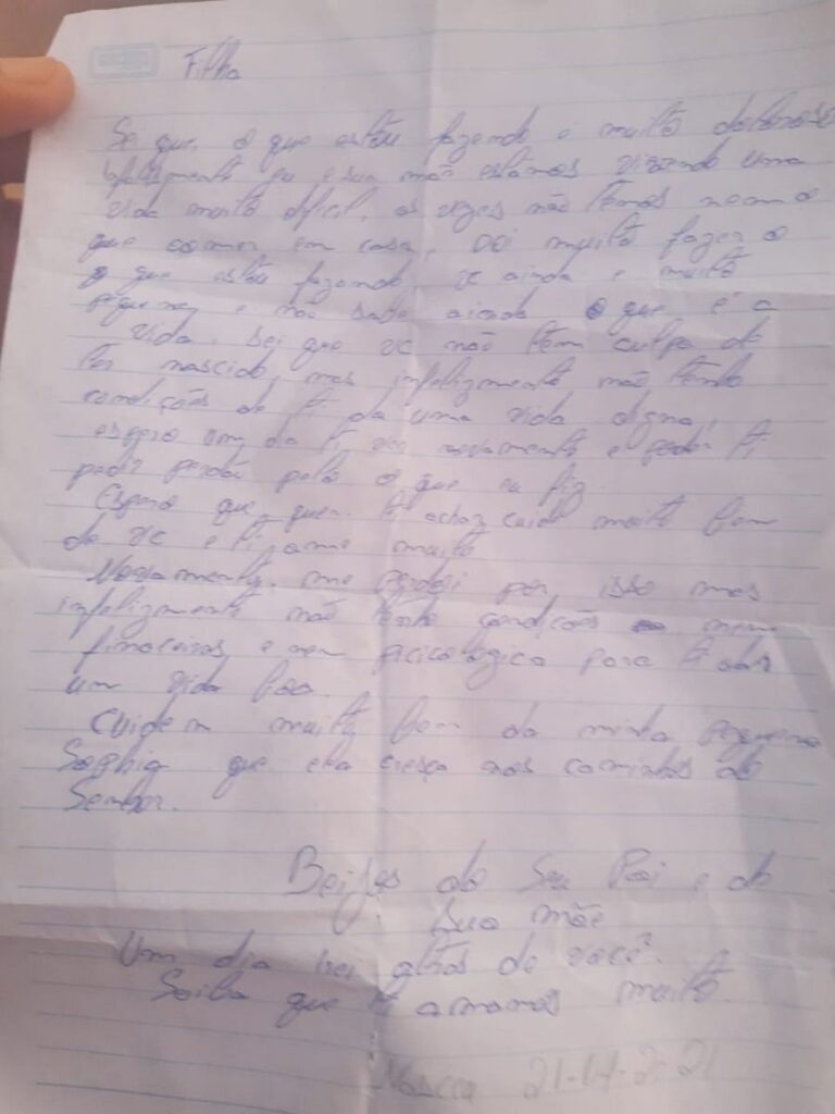 No papel, identificam a criança apenas como Sophia. “Peço que cuidem muito bem da minha pequena Sophia e que ela cresça nos caminhos do Senhor. Saiba que nós te amamos, filha. Beijos de seu pai e de sua mãe”, assinam os pais.