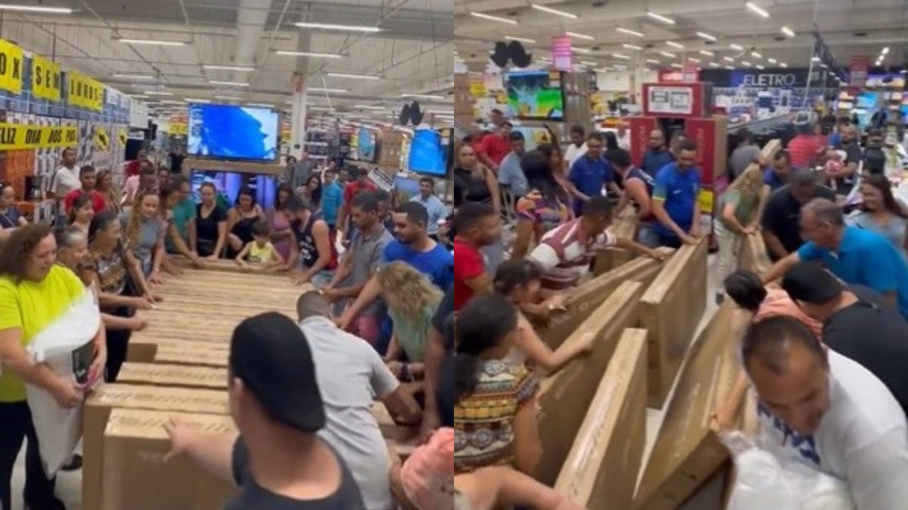 CONFUSÃO GENERALIZADA: Televisão em promoção por 105 reais causa tumulto em supermercado; VEJA VÍDEO pic.twitter.com/MQV0VZKnjM