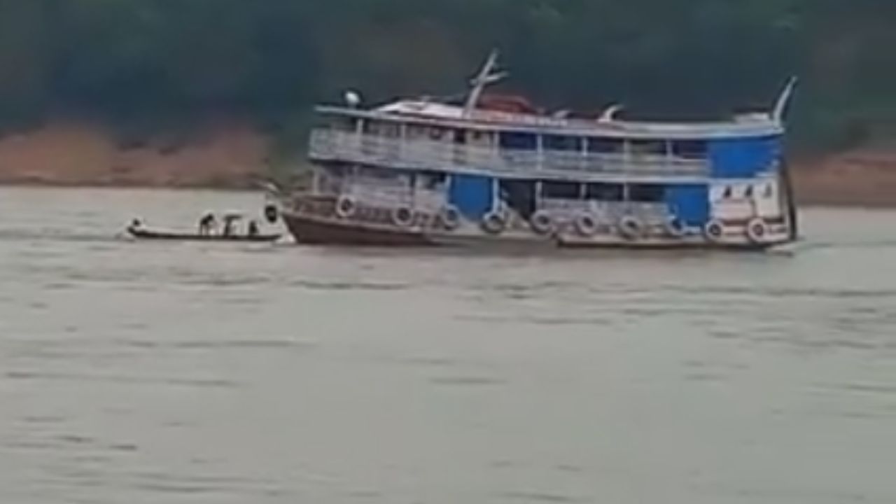 Nos vídeos que circulam nas redes sociais, mostram as pessoas sendo lavadas por rabetas até uma praia e o momento da evacuação da embarcação.