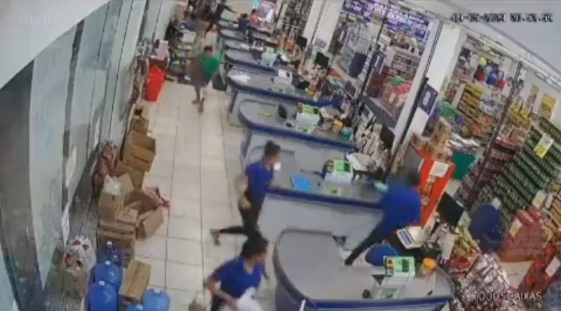 Nas imagens é possível ver o desespero das pessoas quando o assalto é anunciado. Os bandidos mandam todos abaixarem e não reagir. Dois criminosos armados, vão até o caixa e pegam toda renda. Uma das vítimas, se arrasta pelo chão para se proteger.
