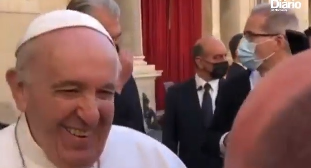 fez uma brincadeira com um grupo de brasileiros nesta quarta-feira (26) ao final de sua audiência geral no Vaticano, segundo informações da agência italiana Ansa: “”Santo Padre, reze por nós, brasileiros”, disse o padre. Francisco respondeu sorrindo e soltou a piada: “Vocês não têm salvação. É muita cachaça e pouca oração”.