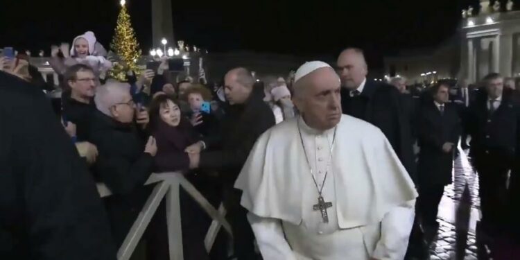 Em determinado momento, no entanto, uma mulher agarrou sua mão direita e o puxou para perto de uma grade que o separava dos fiéis. O Papa reclamou da abordagem e chegou a dar um leve tapa na mão da peregrina para se soltar, saindo visivelmente irritado.