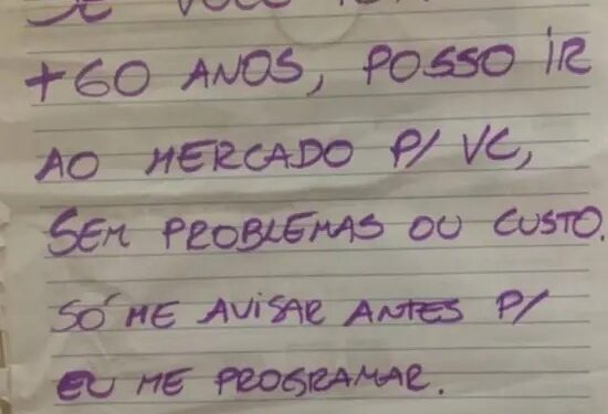 Os cartazes chamaram a atenção da publicitária e jornalista Priscilla Torelli, de 47 anos, que divulgou a proposta no Instagram voltado a moradores do bairro Vila Buarque, na região central de São Paulo. A iniciativa logo conquistou seguidores. “A ideia primeiramente é de que a pessoa doaria parte do seu tempo para ajudar alguém que está no grupo de risco para ir ao mercado ou à farmácia. Ela deveria colocar (no cartaz) de onde é e perto de onde mora para que quem precisa peça ajuda”, disse Priscilla.
