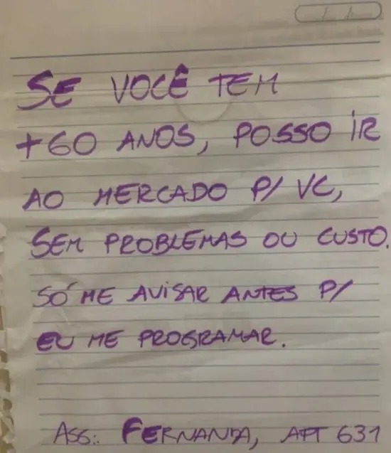 A instrutora de mindfulness Natasha Bontempi, de 38 anos, decidiu transformar o medo do coronavírus em ação. Ela criou modelos de cartazes para serem impressos e colocados em áreas públicas de condomínios, com os nomes de moradores que se oferecem para fazer compras aos vizinhos que não devem sair de casa. Os layouts podem ser baixados e impressos por qualquer um.