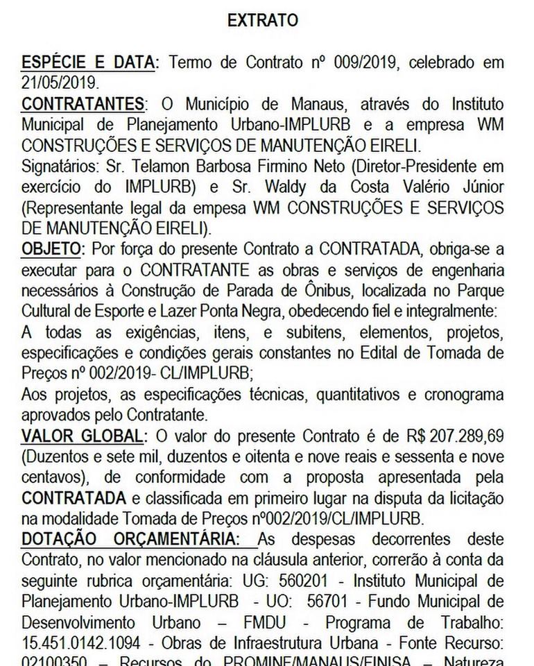 O responsável pela WM, Waldy da Costa Valério Júnior, confirmou que o valor da obra chama atenção se comparada com outras construções de pontos de ônibus já construídas em Manaus, mas negou qualquer irregularidade do contrato.